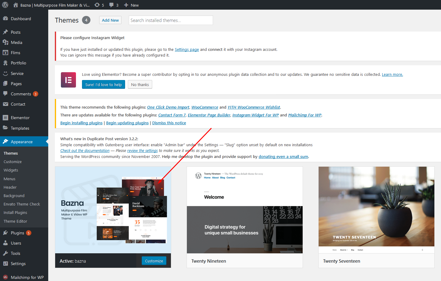 Note: When uploading your theme with the installer, please ensure you are uploading the theme .zip file, not the entire package you downloaded. In this case, you will be uploading Bazna .zip.