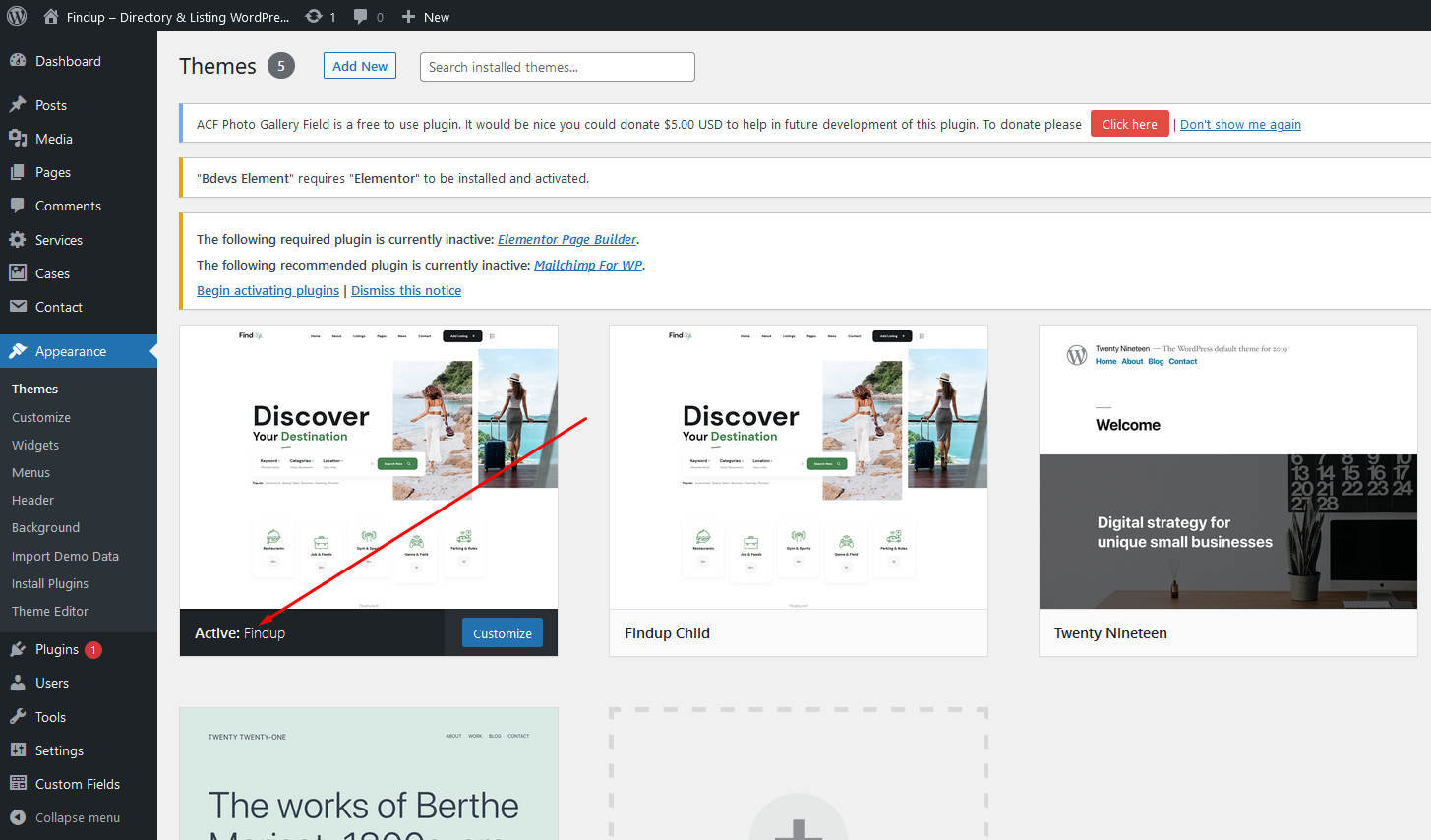 Once uploaded, activate the theme by heading to the “Themes” menu in the WordPress Dashboard. Locate the Finduptheme and hit “Activate”.
