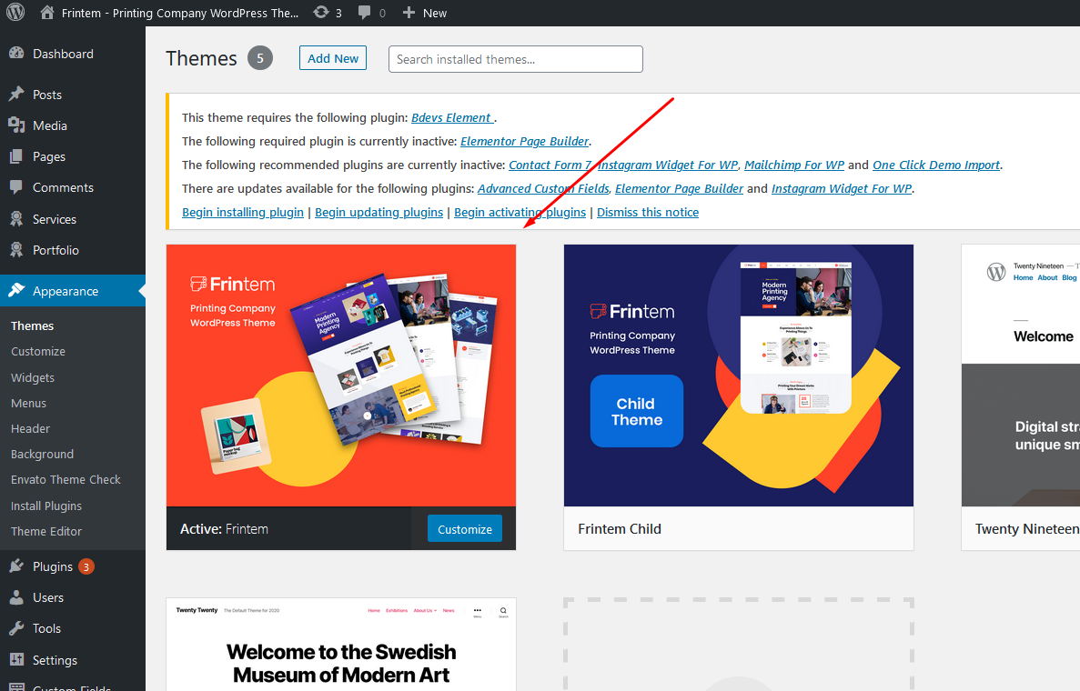 Once uploaded, activate the theme by heading to the “Themes” menu in the WordPress Dashboard. Locate the Frintem theme and hit “Activate”.