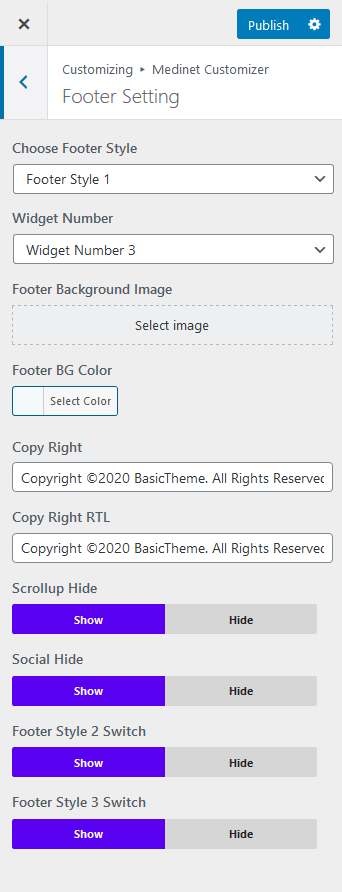 There’re footer copyright text , social link, footer on/off , footer logo will