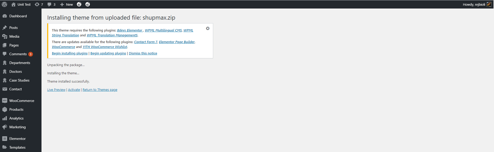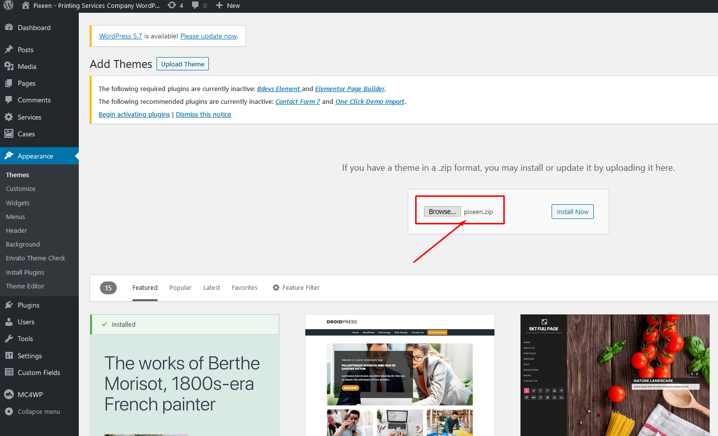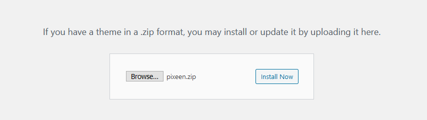 Note: When uploading your theme with the installer, please ensure you are uploading the theme .zip file, not the entire package you downloaded. In this case, you will be uploading Pixeen.zip.