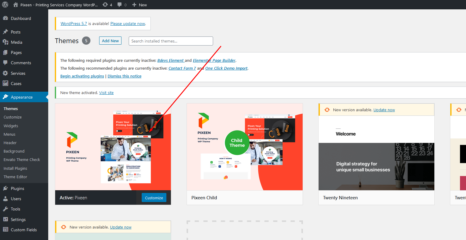 Once uploaded, activate the theme by heading to the “Themes” menu in the WordPress Dashboard. Locate the Pixeentheme and hit “Activate”.